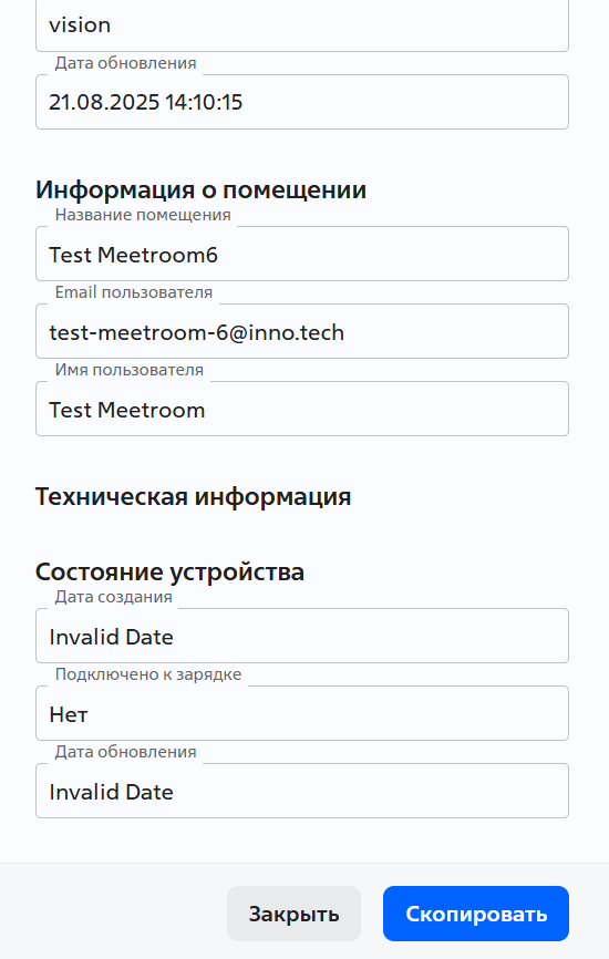 | Панель управления (Controller) | Планшет | controller-release-{версия контроллера}.apk в режиме киоска | На столе в переговорной комнате | Пульт управления переговорной комнатой. Позволяет начать или завершить встречу, управлять аудио и видео, просматривать список участников встречи, приглашать коллег на встречу, управлять громкостью динамиков. Необходим для каждой переговорной комнаты. |