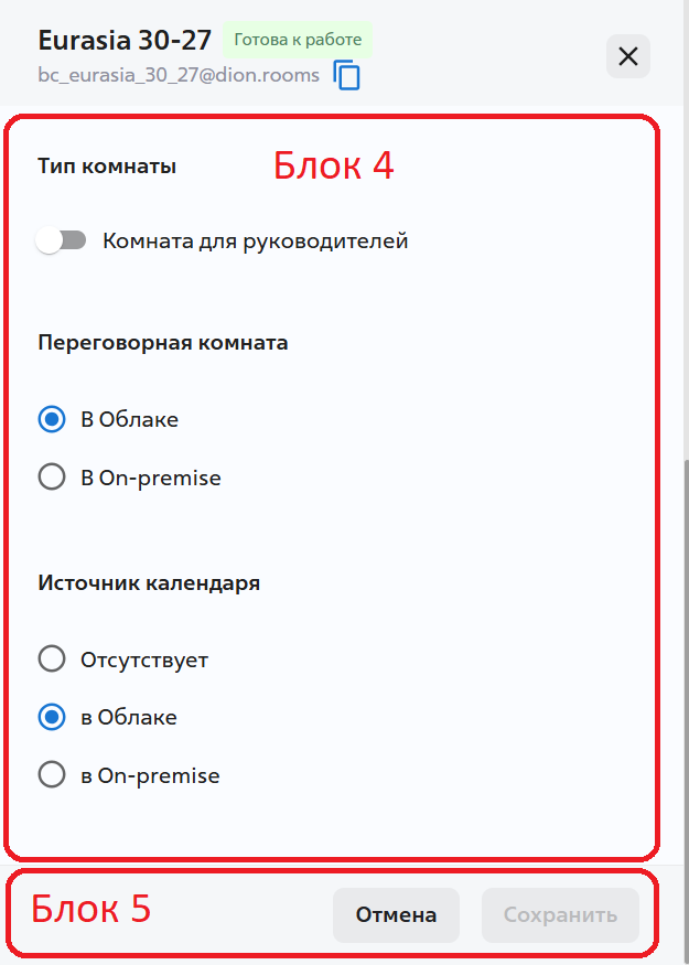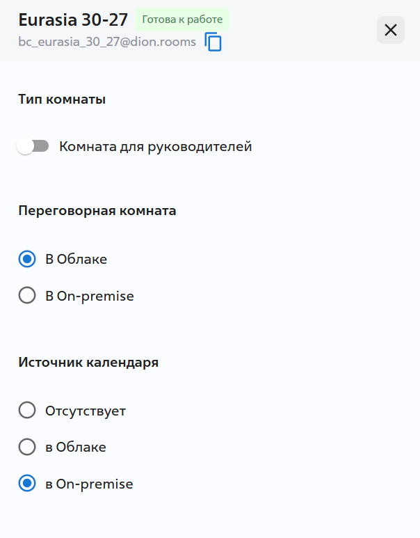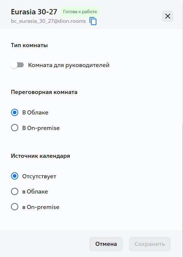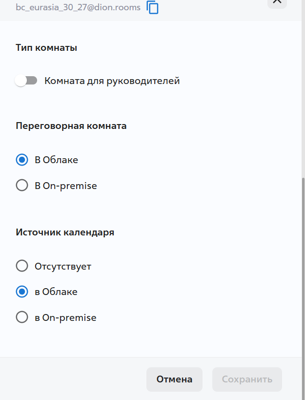 Переговорная Комната: В данной настройке вы переключаете использование инфраструктуры с On-premise(Вашего drcs сервера) на облачную инфраструктуру Dion.