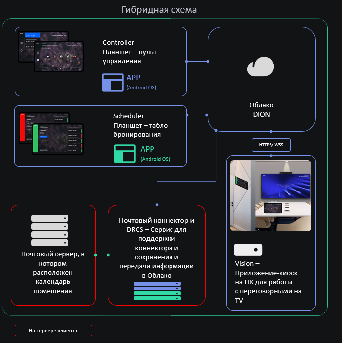 Облачная схема взаимодействия не подразумевает установку на вашей стороне Dion Rooms Server, он находится в облаке DION. Из облака осуществляется управление всеми устройствами: Панель управления (Сontroller), Панель бронирования (Sheduler), Главный Экран (Vision). На вашей стороне устанавливается только Почтовый коннектор для синхронизации вашего Календаря с Календарем Dion. Руководство для настройки DION.Календарь вы найдете по ссылке.