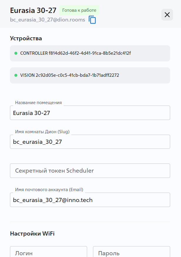 Dion rooms server осуществляет управление всеми устройствами: Панель управления (Controller), Панель бронирования (Sheduler), Главный Экран (Vision). Руководство для настройки Dion Rooms Server вы найдете по ссылке