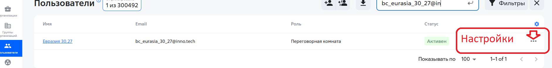 2. Обязательно присвойте всем учётным записям помещений роль "Переговорная Комната" в панели администратора. Для этого перейдите в раздел “Пользователи”, найдите нужную учётную запись и выберете для неё роль "Переговорная Комната" как показано на изображении ниже.