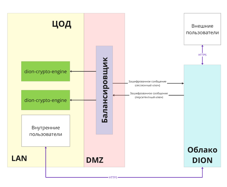 Для этого используется сервис dion-crypto-engine, развернутый в корпоративном контуре. Это позволяет: