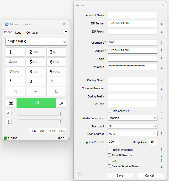 Пример настройки SIP-клиента для регистрации: