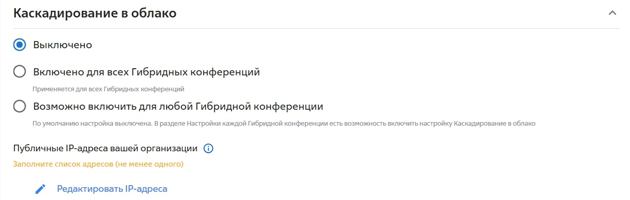 2. В панели администрирования разрешить включать каскадирование в облако вручную для отдельно выбранных конференций или для всех гибридных конференций.