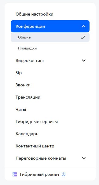 6. Укажите сервисы записи в конференциях с каскадированием в облако. Для этого перейдите в раздел в Общие настройки → Видеохостинг и установите параметр Запись в конференциях с каскадированием в облако в необходимое положение.
