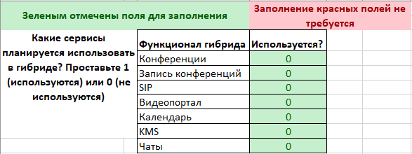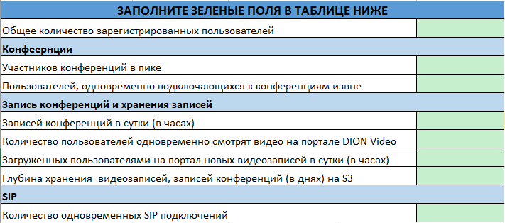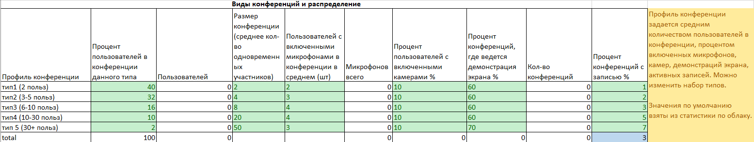 Значения по умолчанию основаны на статистике использования облачного DION, но могут отличаться от реальных потребностей вашей компании. Например, если доля конференций “1-1” в вашей организации составляет не 40, а 80 процентов от всех конференций, необходимо отредактировать второй столбец. Если в вашей организации 50% пользователей включают камеры, необходимо также поменять значение в таблице. Если данных по использованию нет, можно ориентироваться на стандартные предзаполненные параметры.