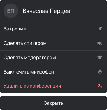 - Может назначать/отзывать у другого участника роль модератора/спикера