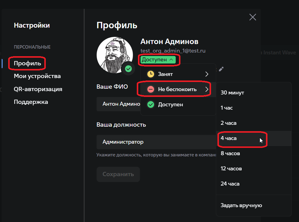 Доступен — пользователь готов к общению и приему звонков. Чтобы установить статус, выберите значение Доступен из выпадающего меню и укажите временной интервал его действия;