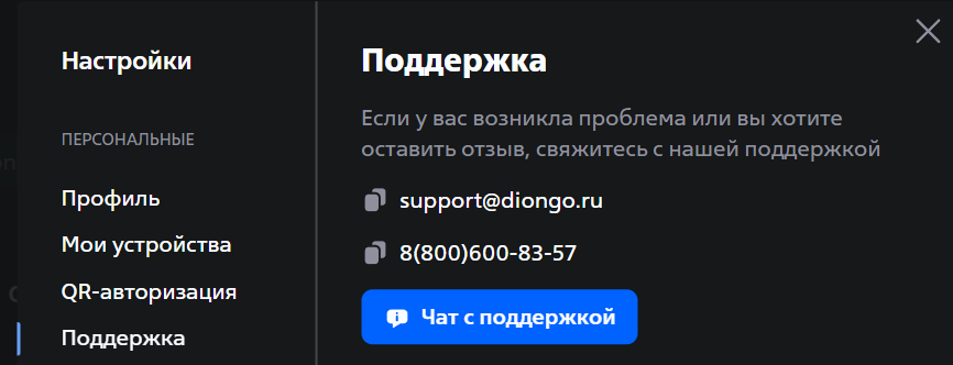 Поддержка – контактная информация технической поддержки (e-mail и телефон) и кнопка для перехода в чат. Вы можете обратиться в поддержку по следующим вопросам:
