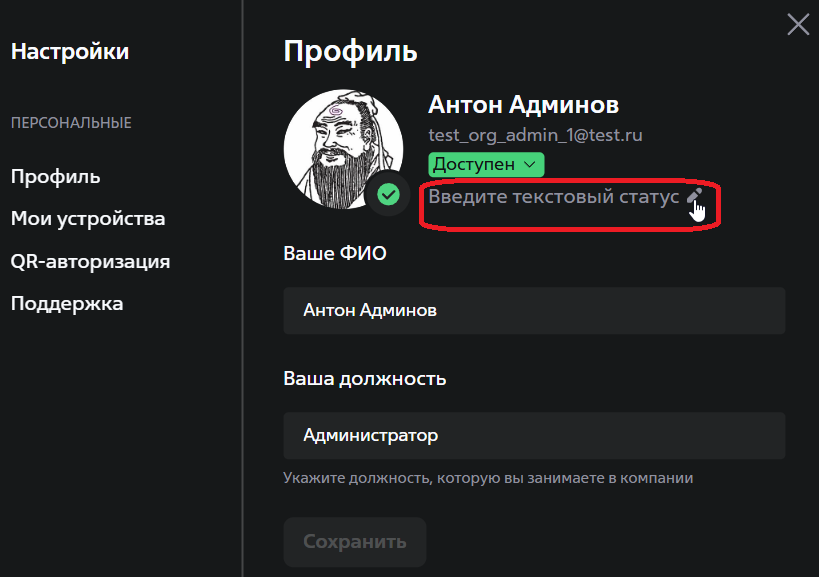 блок со статусами – статус присутствия и произвольный статус, которые отображаются для других пользователей в режиме реального времени (подробнее см. раздел «Статусы пользователя» ниже);