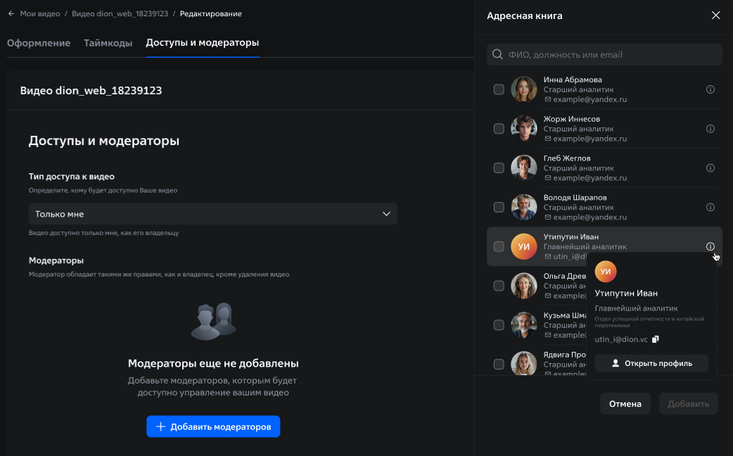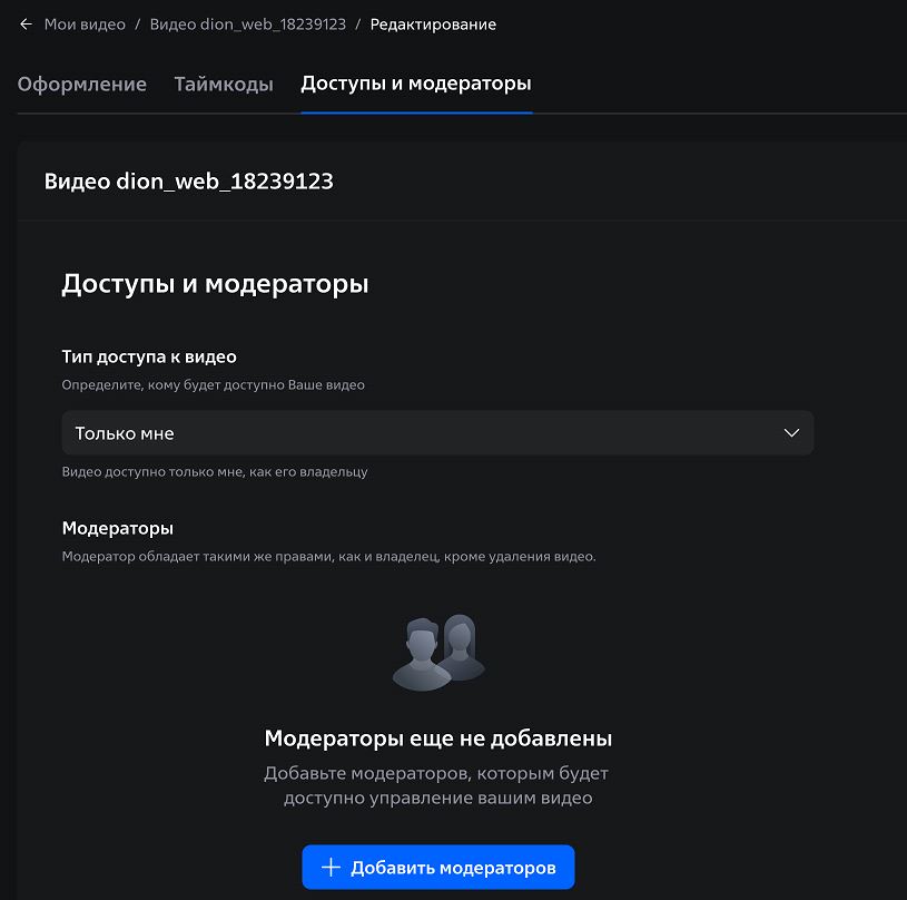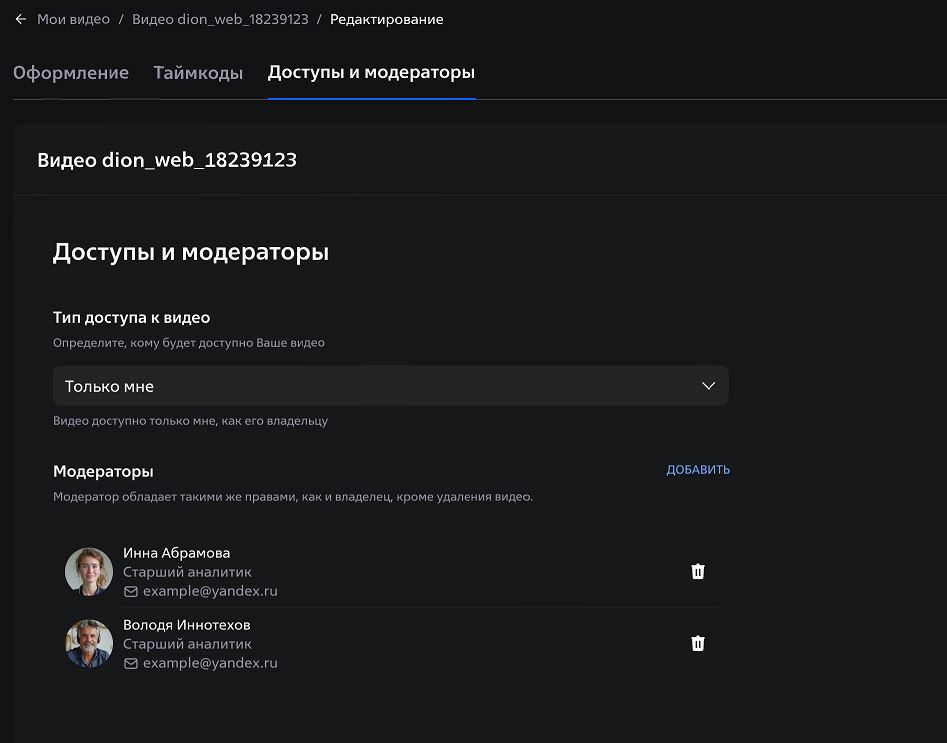 Модераторы получат те же права, что и Владелец видео, за исключением возможности удалять видео или других модераторов.