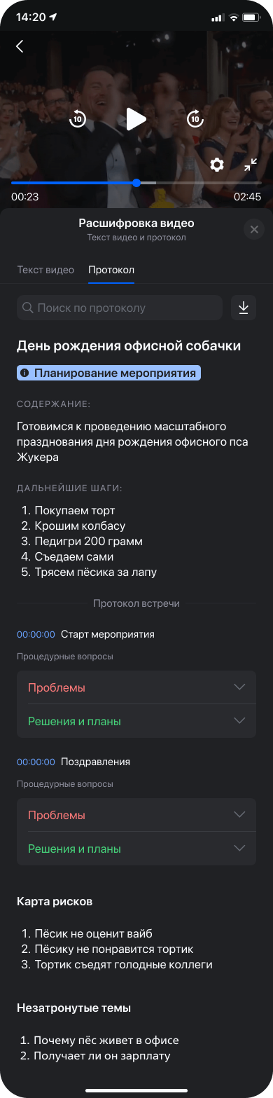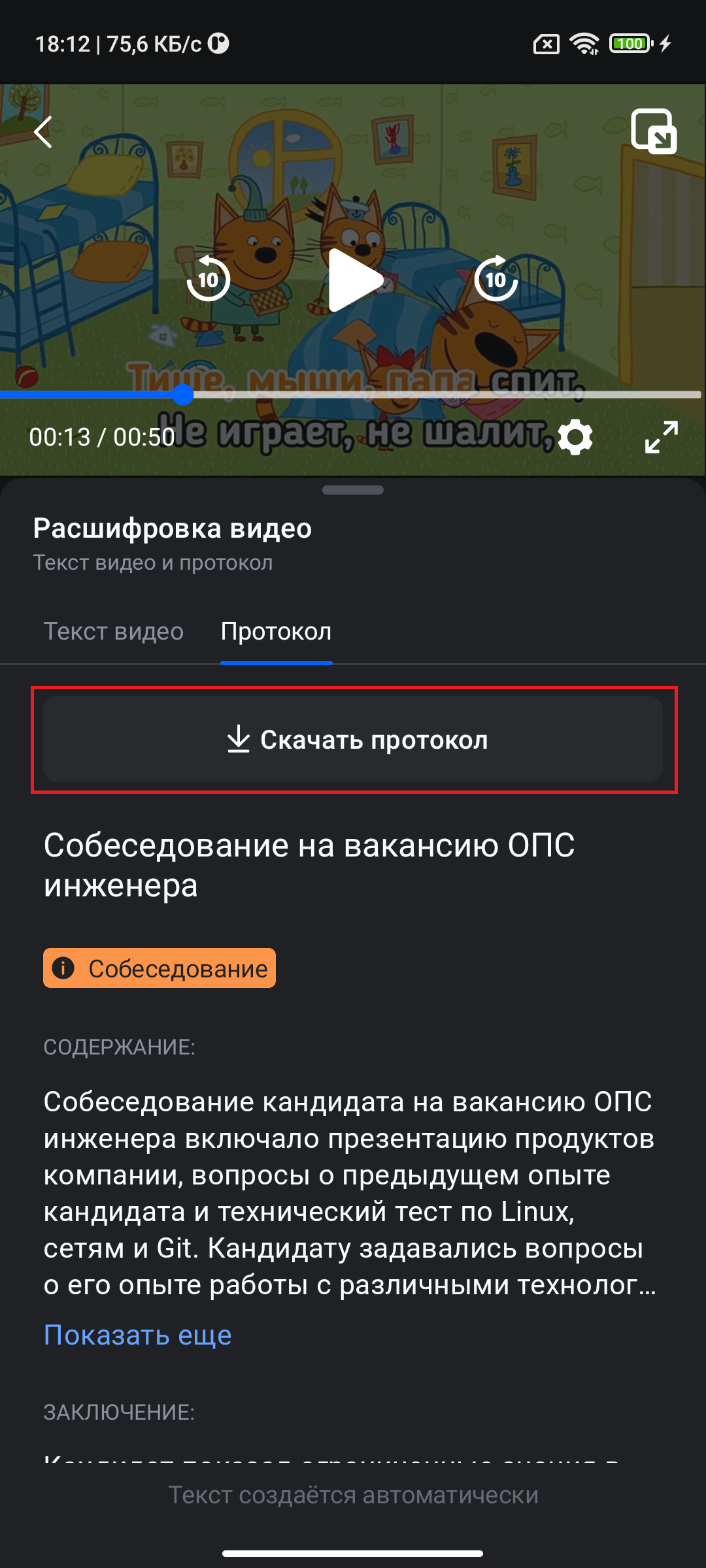 В разделе “Расшифровка видео” можно ознакомиться и скачать протокол с содержанием встречи в формате TXT.