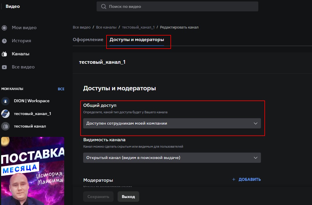 ❗ Модератор канала может настраивать только “видимость канала”. Регулировать “общий доступ” к каналу модератор не может.