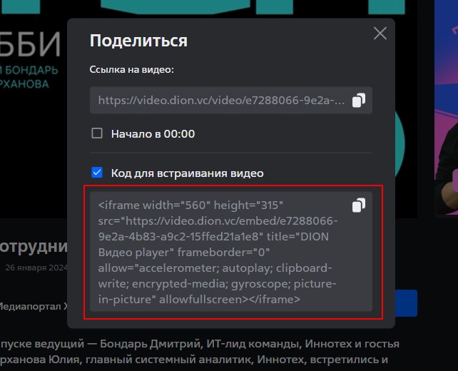В открывшемся окне отметьте чекбокс "код для встраивания видео" |