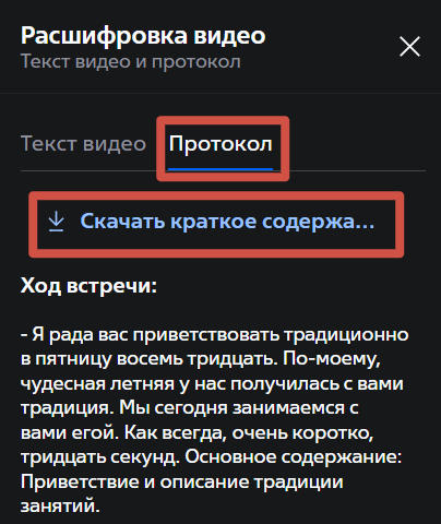 Для видео, добавленных или размещённых ранее, остаётся краткое содержание.Протокол предоставляется для всех типов видео: как для записанных конференций, так и для загруженных видео. Чтобы просмотреть протокол, необходимо, чтобы он был успешно сформирован и загружен для выбранного видео.