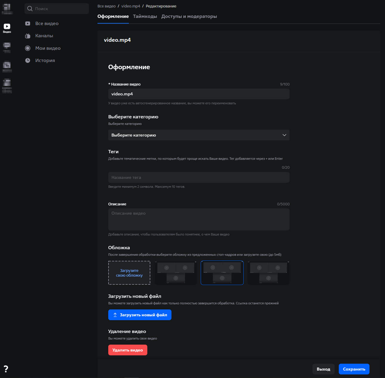 Для создания таймкодов необходимо перейти в раздел редактирования видео и выполнить следующие действия.