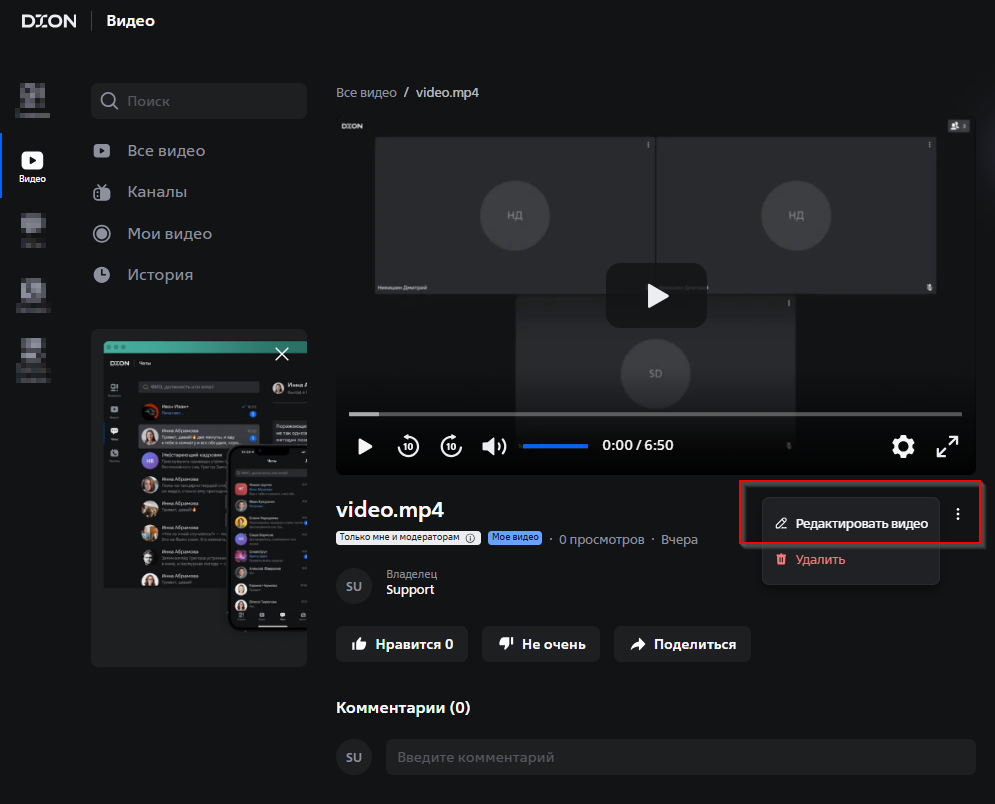 Перейти на страницу редактирования записи можно в всплывающем меню нажив на кнопку три точки в списке записей раздела Мои видео или же на странице записи