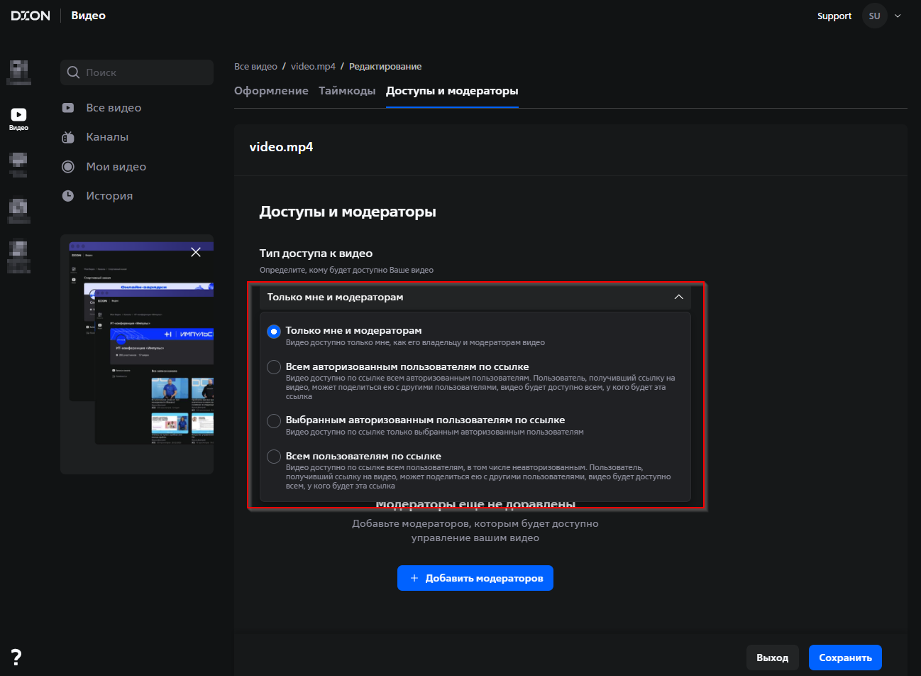 *Для добавление данного типа доступа, владелец должен быть добавлен в группу пользователей с доступом к созданию публичных видео. Подробная информация содержится в разделе “Группы пользователей”.