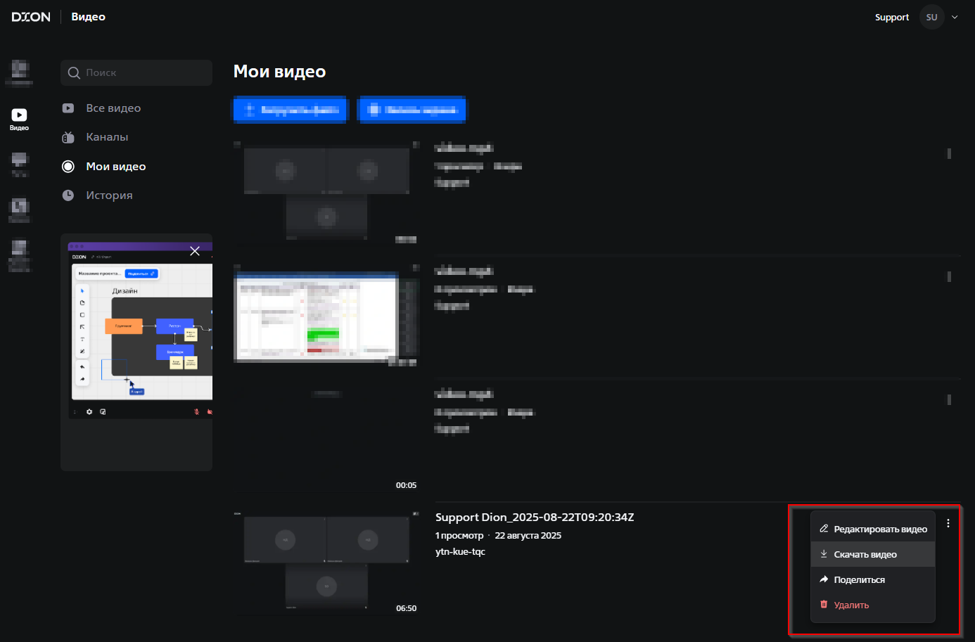1. Скачать запись из списка "Мои видео" через кнопку вызова контекстного меню (три точки) нажать скачать видео