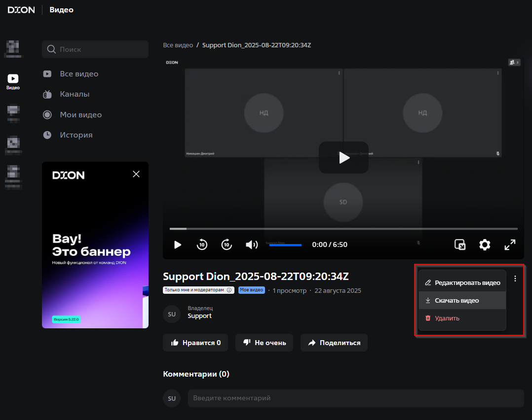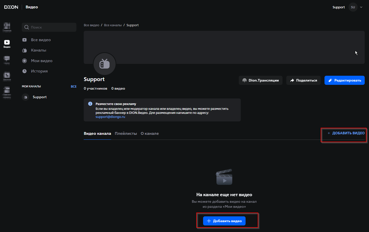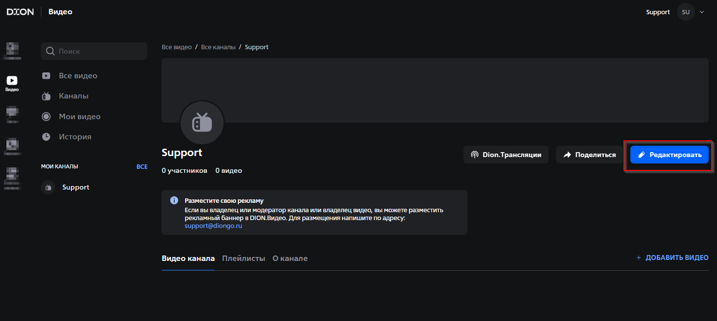 Владельцы видео, каналов и модераторы каналов в облачной версии Dion.Видео теперь смогут инициировать размещение рекламного баннера в интерфейсе приложения.