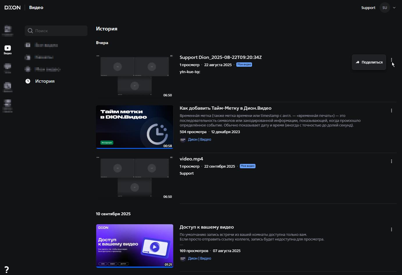 В истории отображаются все просмотренные вами видео с возможностью скопировать ссылку на конкретную запись через три точки и кнопку «Поделиться».