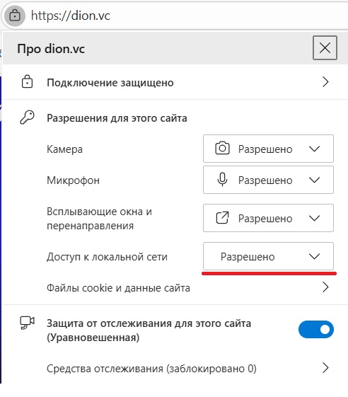 Чтобы настроить автоматическое подключение к комнате Dion в десктоп-приложении при переходе по ссылке в Google Chrome 142+ или Edge 143+, разрешите Доступ к локальной сети для dion.vc: