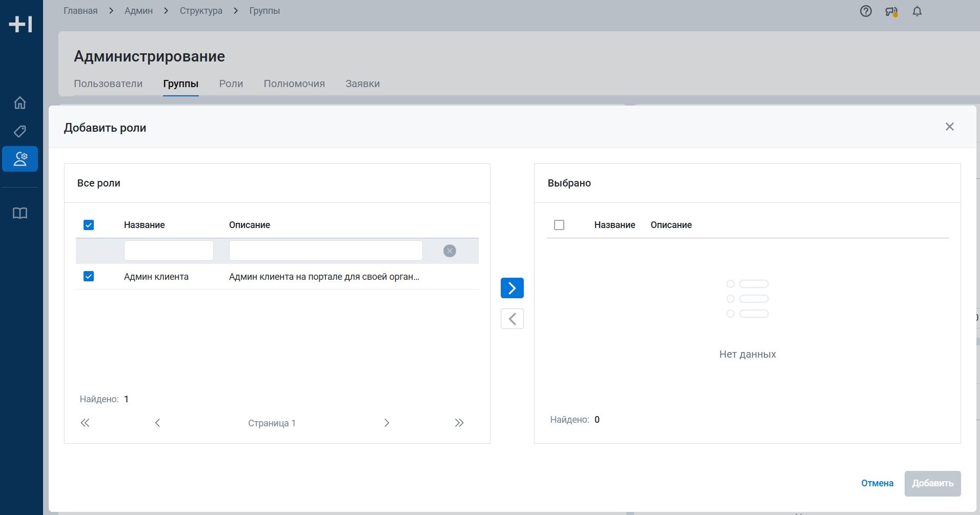 6. При необходимости в окне Пользователи группы выберите пользователя и в окне Список ролей справа добавьте роль для выбранного пользователя.