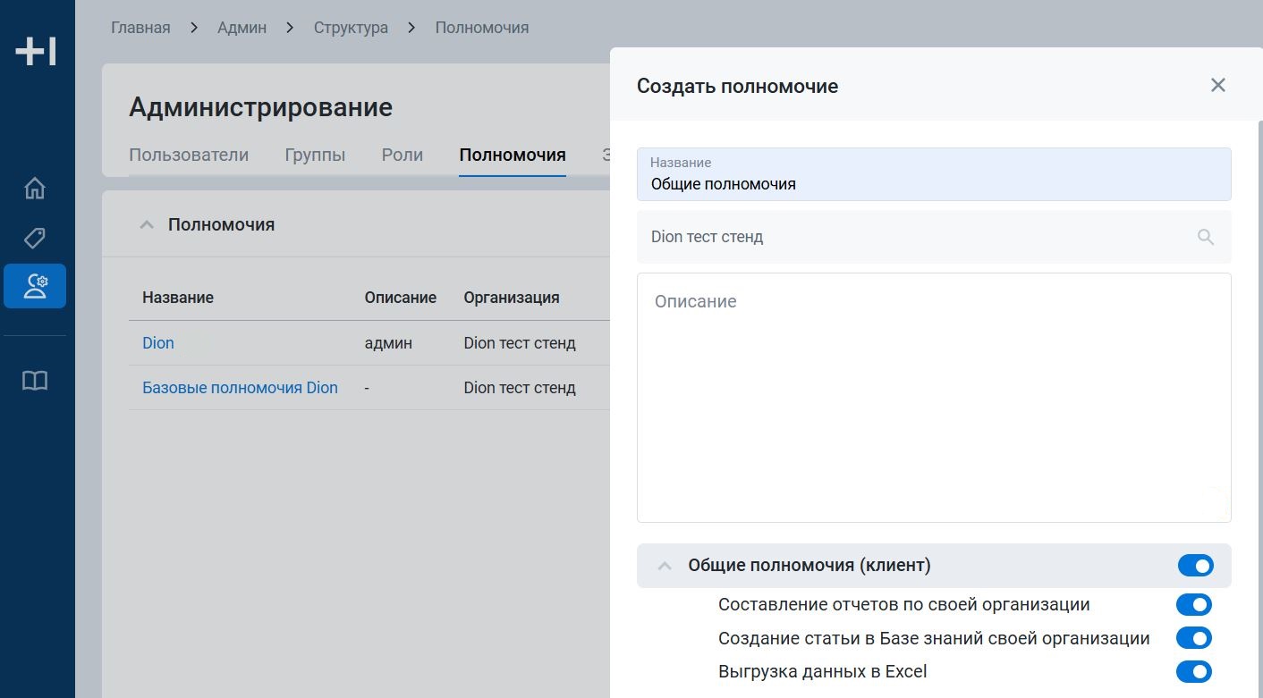 1. В разделе Администрирование на вкладке Полномочия нажмите на кнопку Создать.