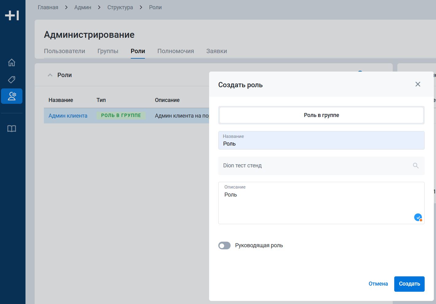 1. В разделе Администрирование на вкладке Роли нажмите на кнопку Создать.