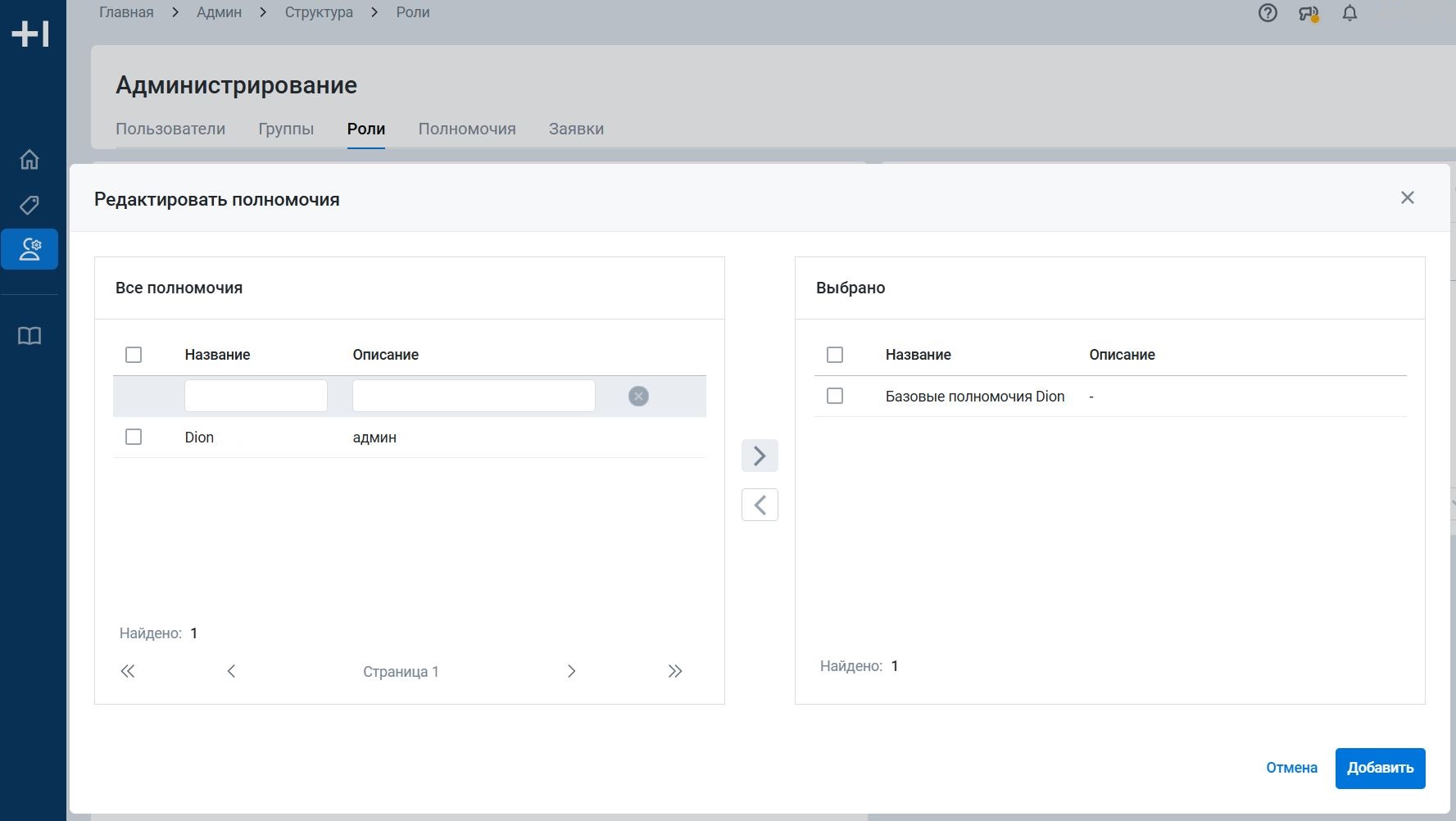 5. Чтобы добавить полномочия для роли, выберите роль в списке и в окне Полномочия справа добавьте полномочия для роли.