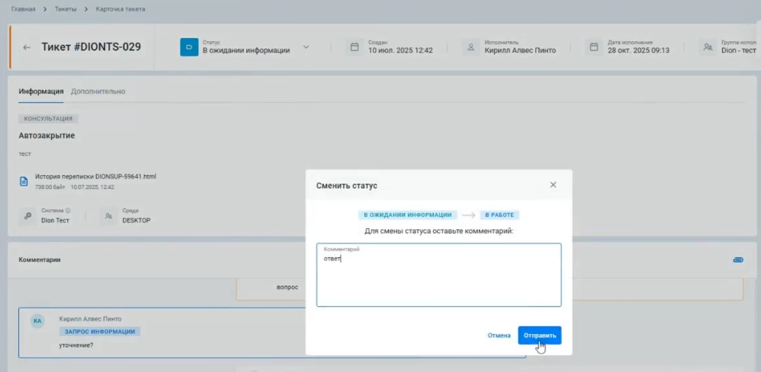В процессе работы над тикетом специалист может задать уточняющий вопрос по обращению. При этом статус тикета изменится на В ожидании информации. Мы рекомендуем отвечать специалисту поддержки со сменой статуса: