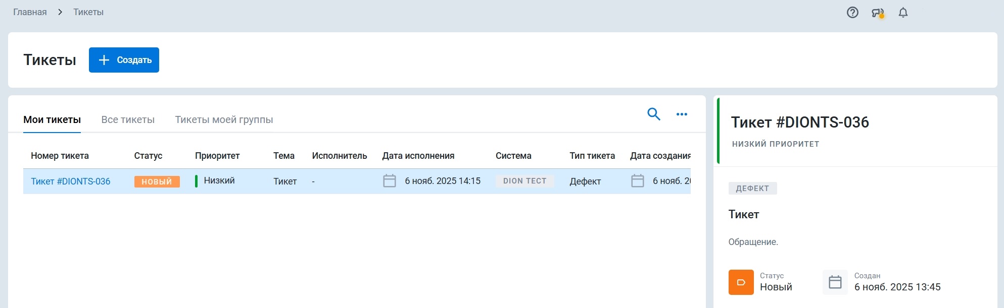 Созданный тикет будет отображен в списке тикетов со статусом Новый.