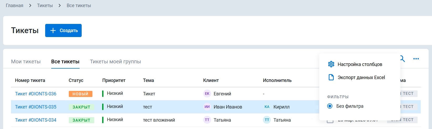 При необходимости вы можете отфильтровать тикеты по всем столбцам, нажав на значок лупы, а также настроить отображение столбцов и экспортировать список тикетов.