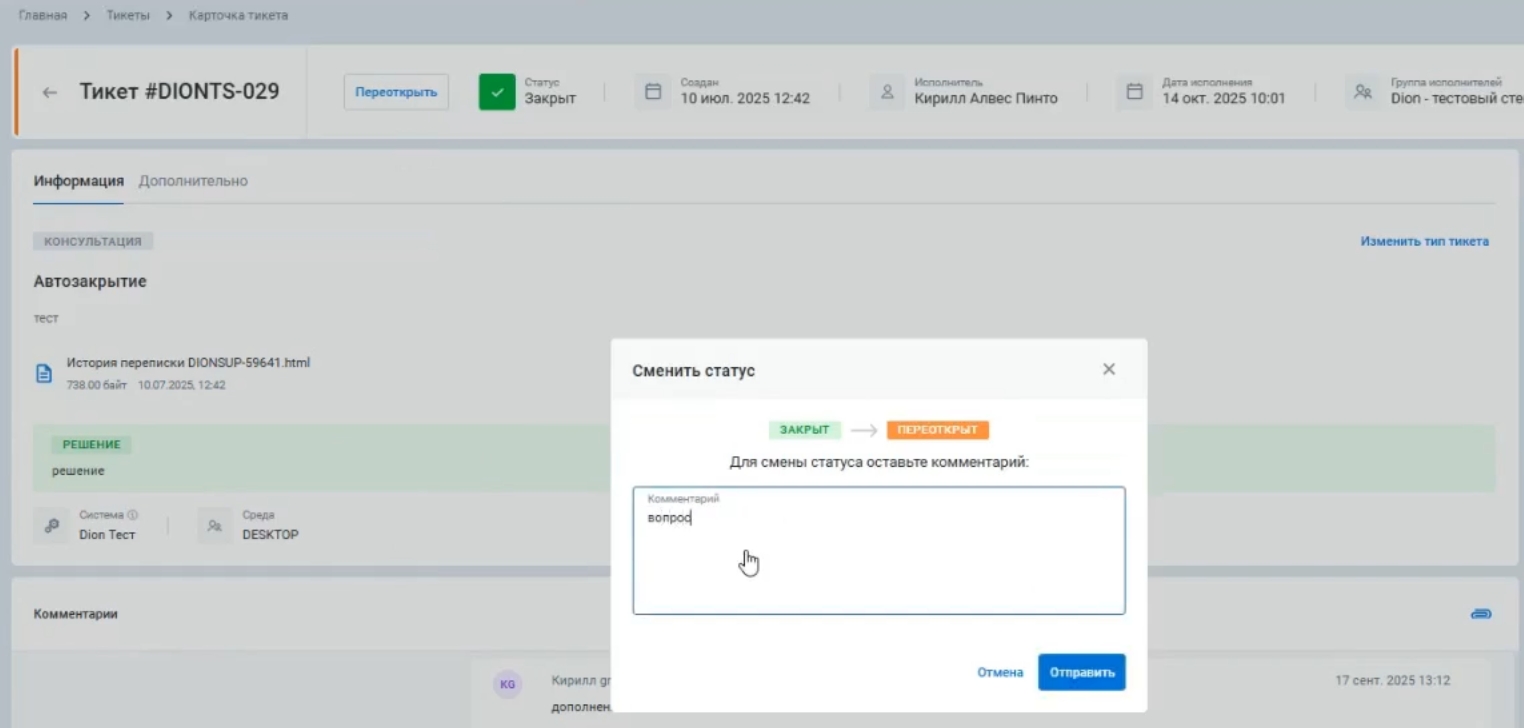 Тикет будет отображен в списке тикетов со статусом Переоткрыт.